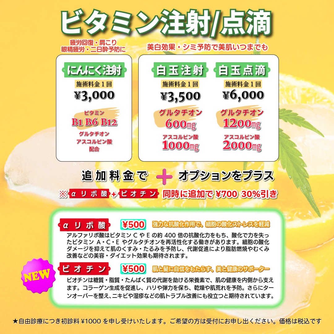 にんにく注射は、仕事、ストレス、スポーツなどによる、肉体疲労、眼精疲労、全身倦怠感、食欲不振、肩こり、腰痛などの改善を目的とした注射です。